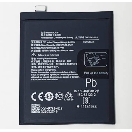 Batería compatible con OnePlus 8 (IN2013), modelo BLP761. Capacidad de 4320 mAh y voltaje de 3.87 V. Repuesto de alta calidad con protección frente a sobrecarga y temperatura. Envío rápido desde España con garantía 3 años.