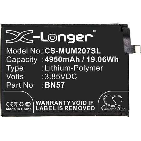 Batería BN57 de la marca Cameron Sino compatible con Xiaomi Poco X3 NFC. Capacidad de 4950 mAh, tecnología Li-polymer y rendimiento estable para recuperar la autonomía original. Envío rápido desde España.