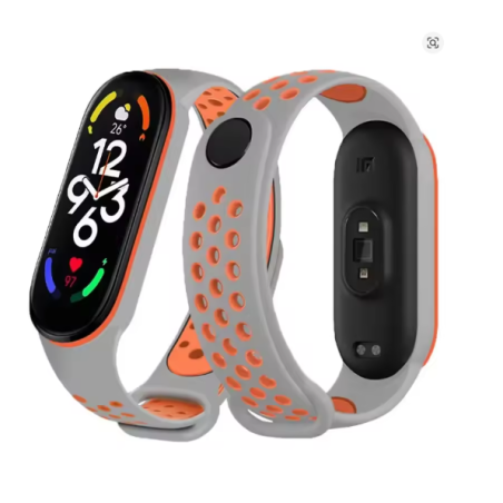 Correa deportiva gris claro y naranja compatible con Xiaomi Mi Band 5, Mi Band 6 y Amazfit Band 5. Fabricada en silicona suave, flexible y transpirable. Cómoda, resistente al sudor y ajustable. Envío rápido desde España.
