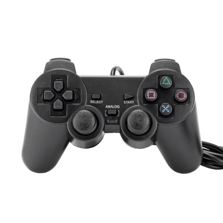El mando con cable para PS2 es la opción perfecta para disfrutar de tus juegos de PlayStation 2 con una experiencia fluida y realista. Diseñado con joysticks analógicos y vibración Dual Shock, aporta precisión y emoción en cada partida 🎮.